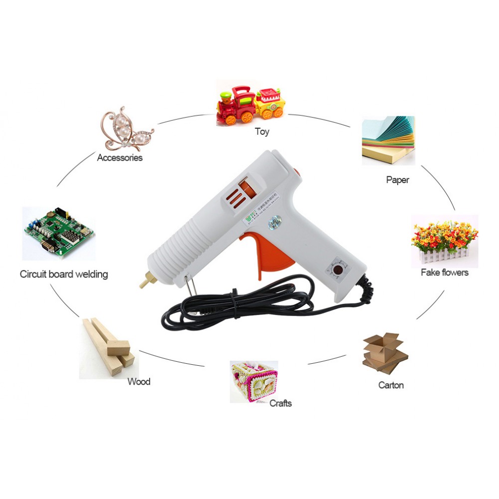 Πιστόλι θερμικής σιλικόνης με ρυθμιζόμενη θερμοκρασία. Διαθέτει αναδιπλώμενη βάση για εύκολή τοποθέτηση του πιστολιού και ενδεικτική λυχνία ισχύος. Κατάλληλο για ράβδους σιλικόνης 11-11.5mm
