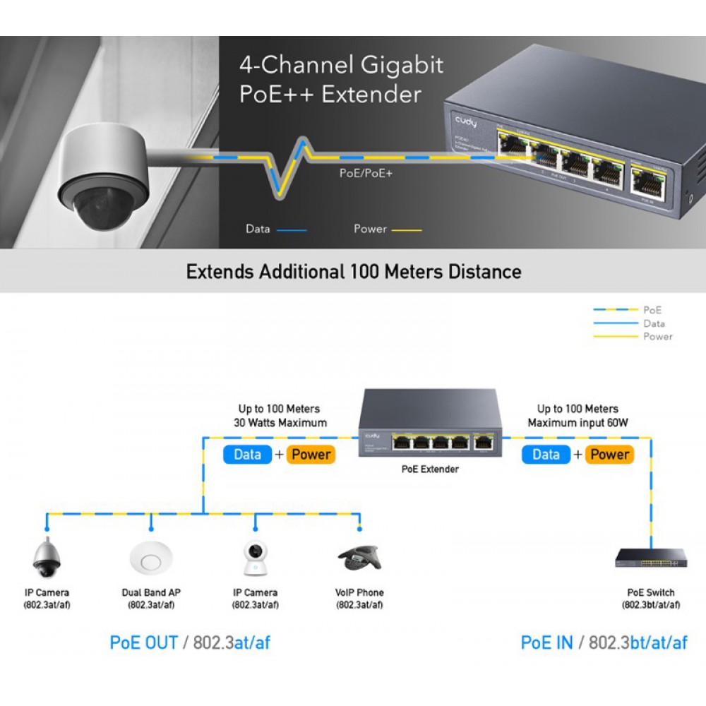 Το PoE++ extender POE40 από την Cudy σας επιτρέπει να επεκτείνετε το δίκτυο σας με 4 θύρες PoE+. Είναι πλήρως συμβατό με συσκευές PoE, όπως κάμερες IP, access points, τηλέφωνα IP και καταγραφικά.