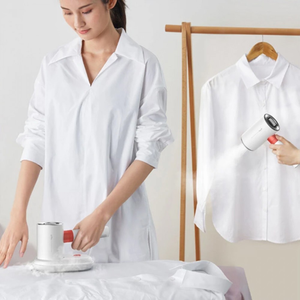 Ατμοκαθαριστής ρούχων χειρός της Deerma με διπλή λειτουργία, αποστείρωσης και σιδερώματος των ρούχων. Εξοπλίζεται με διπλό αγωγό θερμότητας παράγοντας μεγάλη ποσότητα ατμού που μπορεί να φτάσει έως και τους 180°C. Μέσω του ατμού υψηλής πίεσης που παράγει σας επιτρέπει να σιδερώσετε τα ρούχα σας είτε οριζόντια σε επίπεδη επιφάνεια είτε κάθετα σε κρεμάστρα. Στην συσκευασία συμπεριλαμβάνεται θήκη για την αποθήκευση του ατμοκαθαριστή και πλαστικό δοχείο νερού.