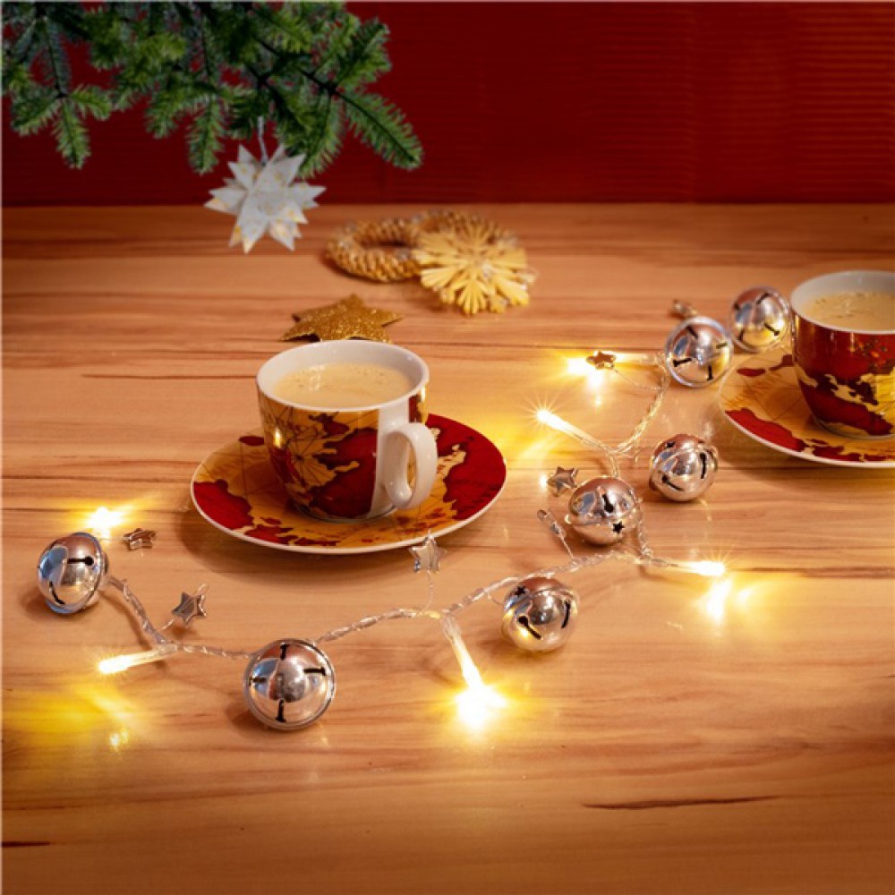 Λαμπάκια LED με διακοσμητικά μεταλλικά κουδούνια και αστέρια σε ασημί χρώμα που συνδέονται με ένα διαφανές καλώδιο συνολικού μήκους 1.3 μέτρα. Είναι ιδανικά για την χριστουγεννιάτικη διακόσμηση σε οποιονδήποτε εσωτερικό χώρο.