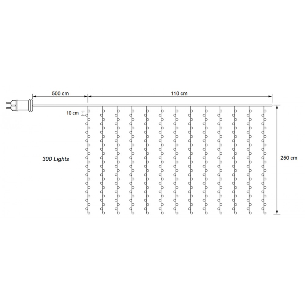 Λαμπάκια LED τύπου (300 LEDs) κουρτίνα με διαφανές καλώδιο συνολικού μήκους 6.1m, με θερμοκρασία χρώματος είναι 3000K (θερμό λευκό). Είναι ιδανικά για την χριστουγεννιάτικη διακόσμηση σε οποιονδήποτε εσωτερικό και εξωτερικό χώρο χάρη στον βαθμό προστασίας IP44.