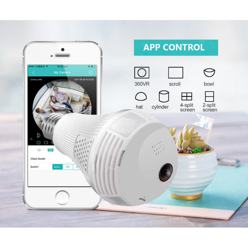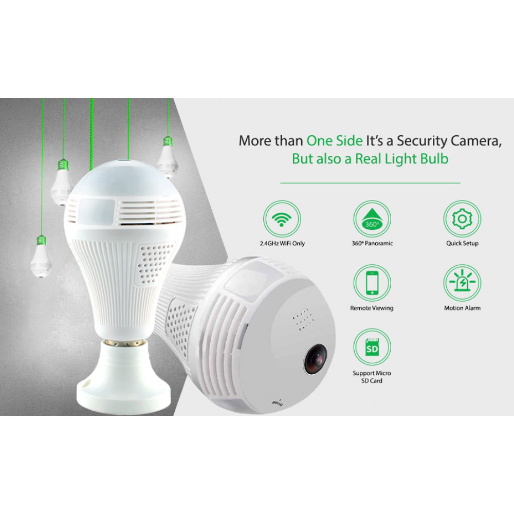 Λάμπα LED με ενσωματωμένη κάμερα της Innotronic με δυνατότητα πανοραμικής λήψης βίντεο και φωτογραφίας υψηλής ανάλυσης 1080p καθώς και την καταγραφή τους σε κάρτα microSD ή σε cloud. Υποστηρίζει σύνδεση με Wi-Fi και μπορεί να συνδεθεί με smartphone συσκευή απομακρυσμένα μέσω της εφαρμογής iCSee. Έχει δυνατότητα νυχτερινής λήψης, ώστε να μπορείτε να καταγράψετε τη σκηνή ακόμη και όταν δεν υπάρχει φωτισμός στο χώρο και ανιχνευτή κίνησης. Επιπλέον διαθέτει αμφίδρομη μεταφορά ήχου με noise cancelation.