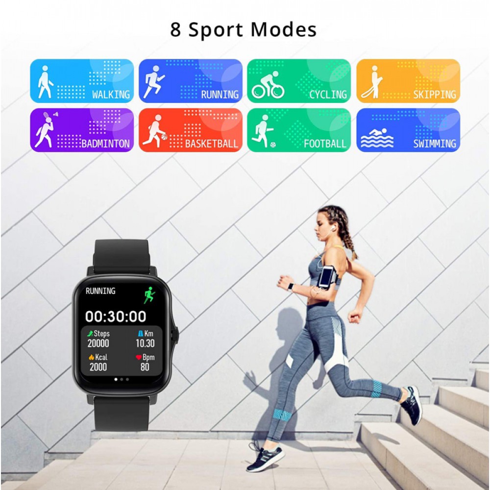 Sport Functions: 8 workout modes: walking, running, cycling, skipping, badminton, basketball, football, swimming; Count steps, distance, and calories burned