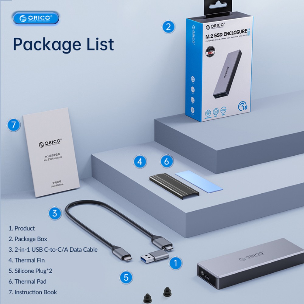 Εξωτερικό περίβλημα της Orico που επιτρέπει την εγκατάσταση ενός δίσκου M.2 NVMe SSD σε μορφή 2280, 2260, 2242 και 2230 και μπορεί να συνδεθεί μέσω θύρας USB ή USB-C USB 3.2 Gen2 σε dekstop ή laptop. Είναι ultra compact, κατασκευασμένη από αλουμίνιο, παρέχει άριστη προστασία από θερμότητα και υποστηρίζει ταχύτητες μετάδοσης έως 10Gbps.