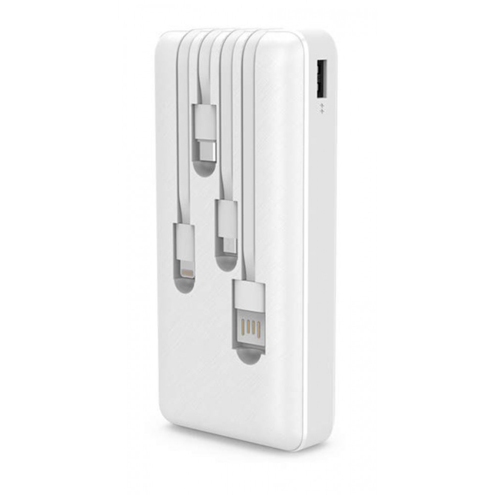 Διαθέτει 1 θύρα εξόδου USB και 3 ενσωματωμένα καλώδια εξόδου USB-C, Lightning και Micro USB με συνολική απόδοση φόρτισης έως 10.5W. Το power bank φορτίζει μέσω της θύρας εισόδου Micro USB και του ενσωματωμένου καλωδίου USB.