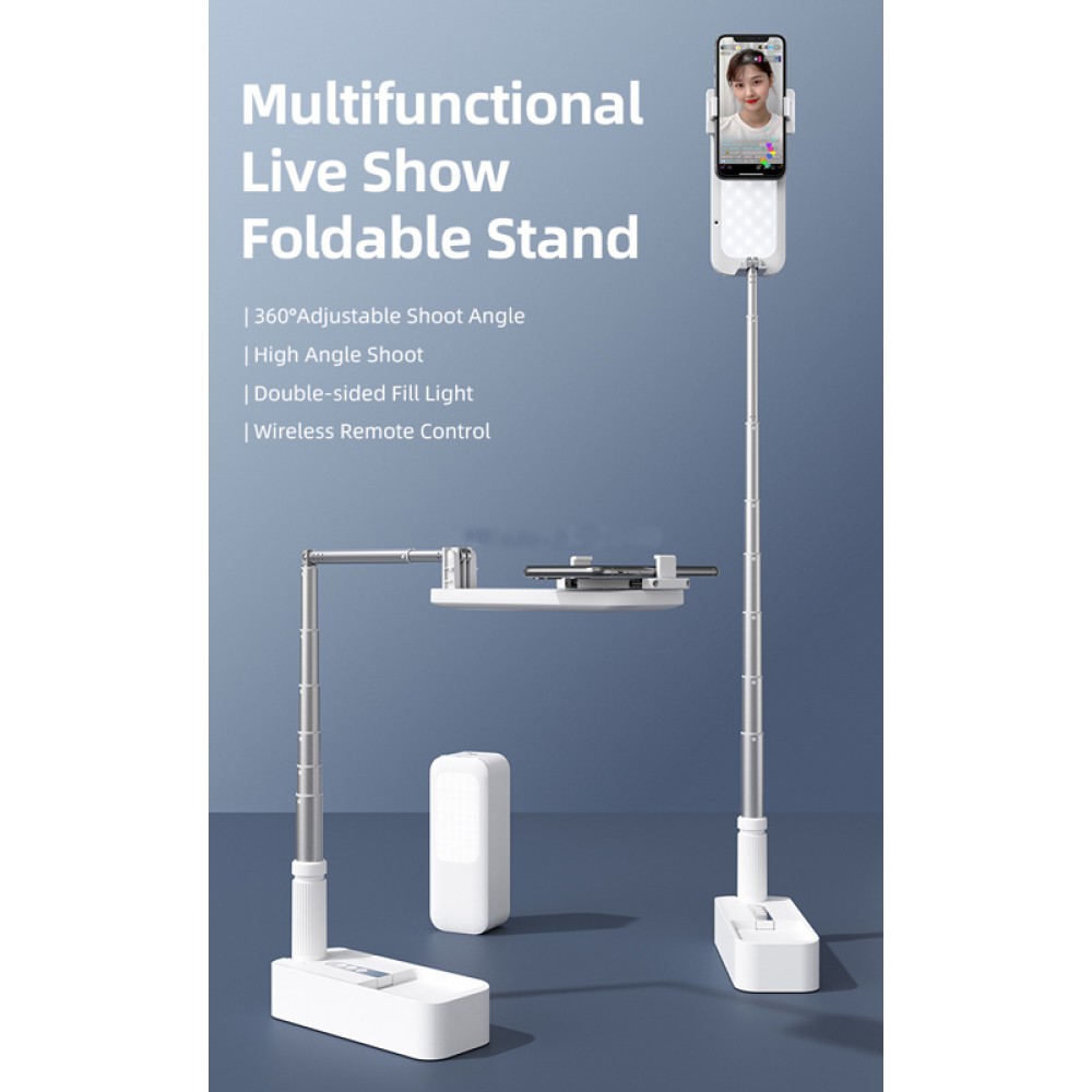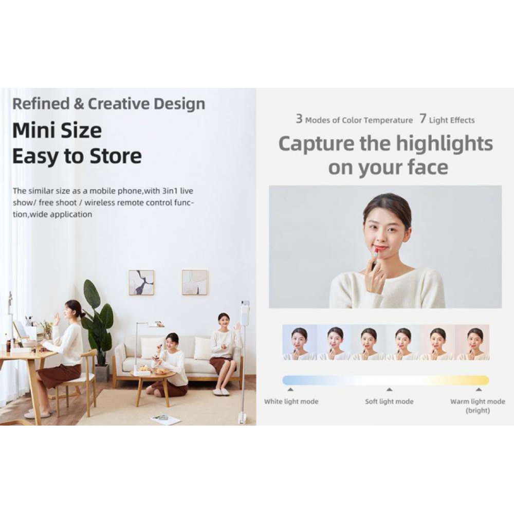 Usams φωτιστική βάση για κινητά, ιδανική για λήψη φωτογραφιών ή βίντεο, μακιγιάζ και live μεταδόσεις. Εξοπλίζεται με ενσωματωμένο ασύρματο χειριστήριο το οποίο συνδέεται με Android και Apple smartphones μέσω Bluetooth για να μπορείτε να χειρίζεστε την κάμερα του κινητού σας ασύρματα. Διαθέτει πτυσσόμενη βάση με δυνατότητα επέκτασης έως 126cm και μπορεί να περιστραφεί 360° ενώ υποστηρίζει και high angle shoot λειτουργία. Διαθέτει double-sided φωτισμό με 3 λειτουργίες θερμοκρασίας χρώματος, white light, soft light, warm light και 7 εφέ φωτισμού. Τροφοδοτείται μέσω θύρας USB Micro.