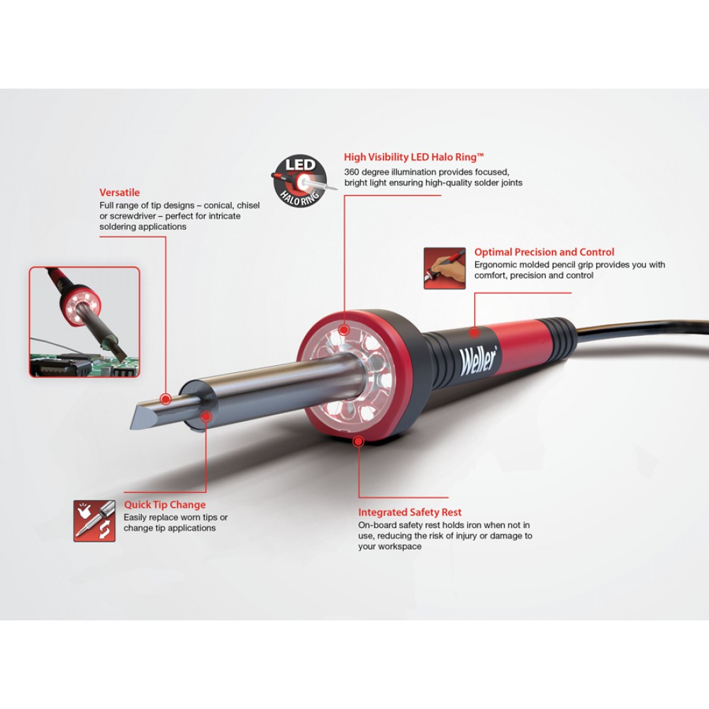 Κολλητήρι 60W της Weller με ανάπτυξη θερμοκρασιών έως 425°C και εύκολο σύστημα αλλαγής μύτης. Εξοπλίζεται με LED φωτισμό για καλύτερη ορατότητα κατά την εργασία σε πιο σκοτεινό περιβάλλον.